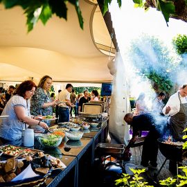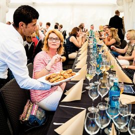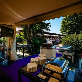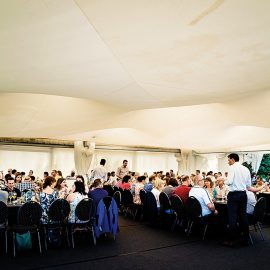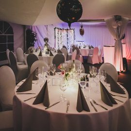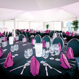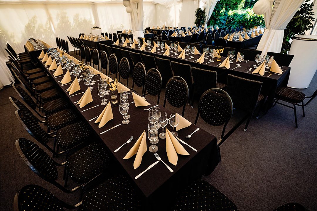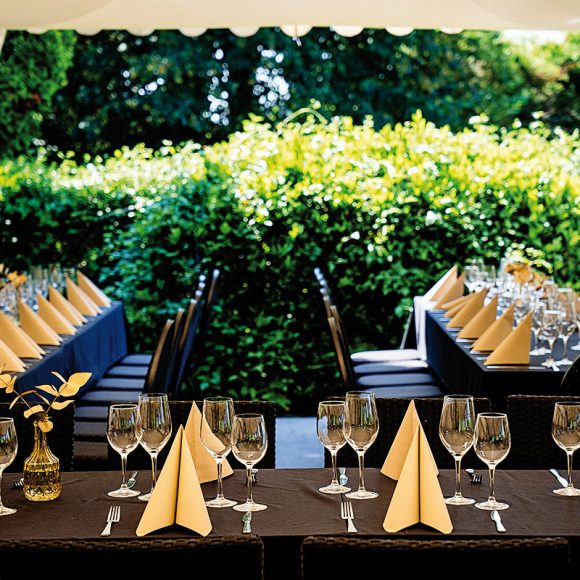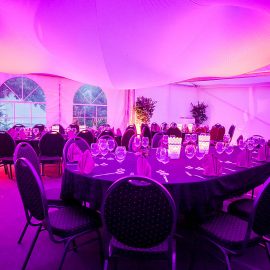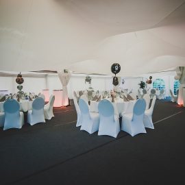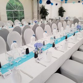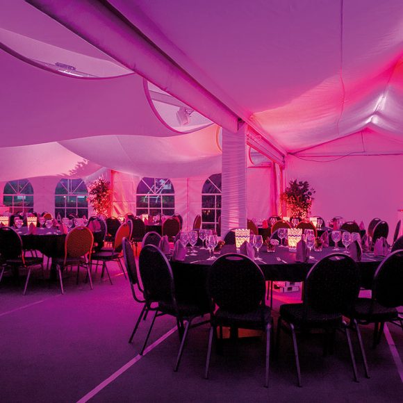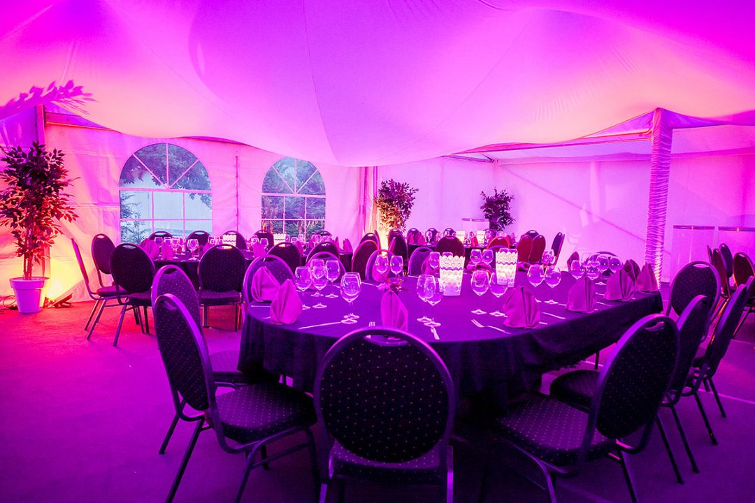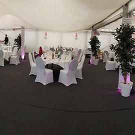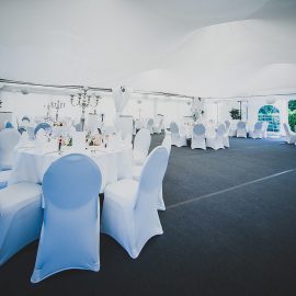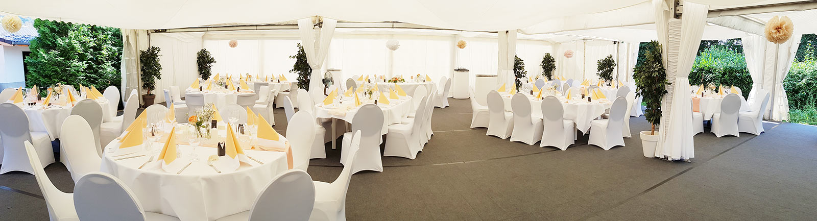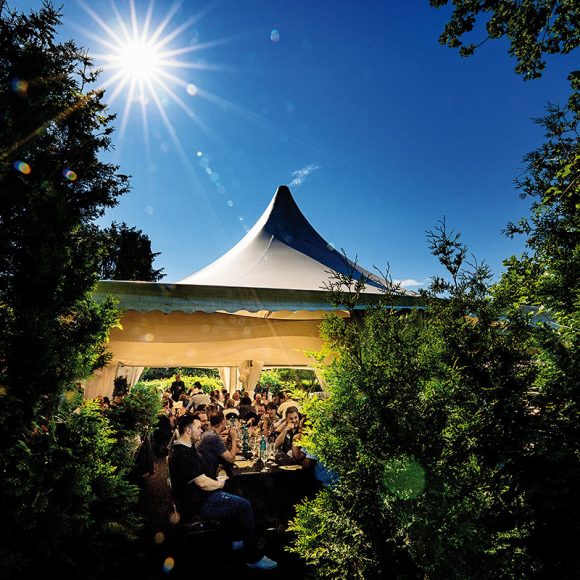 Ganz in Weiß erstrahlt unser Festzelt bei Tageslicht, um sich am Abend durch außergewöhnliche Lichtsysteme in ein traumhaftes Zauberschlösschen zu verwandeln.
